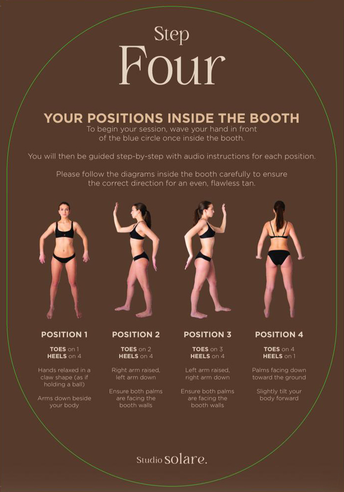 Our fully automated spray booths guide you through every step with voice prompts, clear foot markers, and easy-to-follow pose instructions displayed inside. It’s designed to take the guesswork out of tanning so you get a flawless result every time.